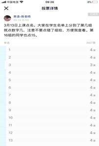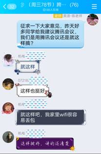 学生们的认可给了我极大的鼓励,在接下来的教学中,我也在不断地改善自己的课堂:为了弥补录课缺乏课堂互动的缺陷,我把每个章节的PPT内容分录成多个视频,每个视频不超过30分钟。对于需要学生进行课堂讨论的话题,我采取将话题以问题群的形式在前一个视频末尾呈现,对参考答案在后续视频的开头进行解说的办法,并通过QQ群分享图片、组织讨论,还通过提前录制视频,就具有共性的作业问题进行集中讲解。课堂氛围就这样活了起来!为了记录学生的出勤状况,又方便我进行逐次统计,我尝试利用QQ群的“投票”功能进行点名,发现这是一个不必借助其它软件而且快捷有效的点名方式。通过不断改进,我的网络教学也逐渐走上了正轨,受到了学生们和学院听课领导的好评。