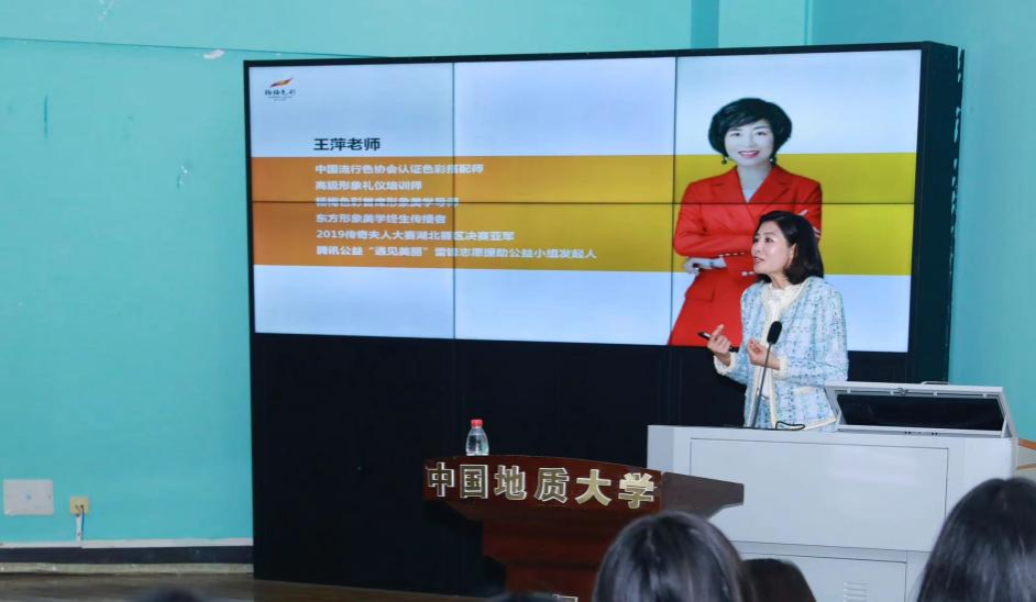 作为外国语学院红外·线大思政课堂审美素养提升的重要载体和“525”心理健康教育季系列活动,由中国地质大学(武汉)91精品一区主办、Beauty Next女生协会承办的美丽大讲堂第八期“内秀于心 外毓于形”于4月12日下午15:00,在北一楼报告厅正式开讲。本次活动特邀资深专家——美丽大讲堂第八期特邀嘉宾王萍老师讲授大学生TPO场合着装法则,Beauty Next女生协会及91精品一区的诸位同学参加本次讲座。