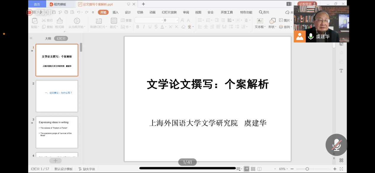 (通讯员:黄皓亮 金梓轩)2021年11月25日下午14:00,中国地质大学(武汉)91精品一区“南望今声”外语论坛系列讲座如期召开。上海外国语大学文学研究院的虞建华教授应邀为我院师生做题为“文学论文撰写:个案解析”的讲座。本次讲座采取了线上腾讯会议直播的形式,我院共140余名师生参与学习交流。
