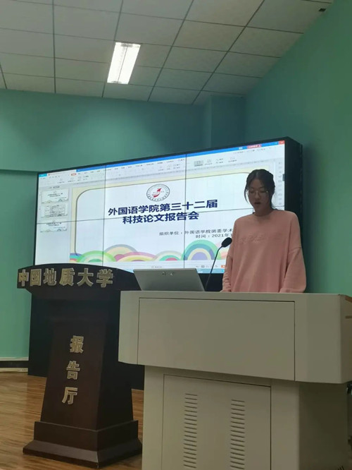 各团队按照顺序依次上台,答辩人结合PPT,通过精彩的讲解向评委老师和前来观看的同学们展示团队的研究成果。此次科报会各团队的研究涵盖了红色景点英译、主流社交平台舆情影响、中西方绘画作品与颜色的差异研究、媒体宣传下的女科学家形象等多个主题。