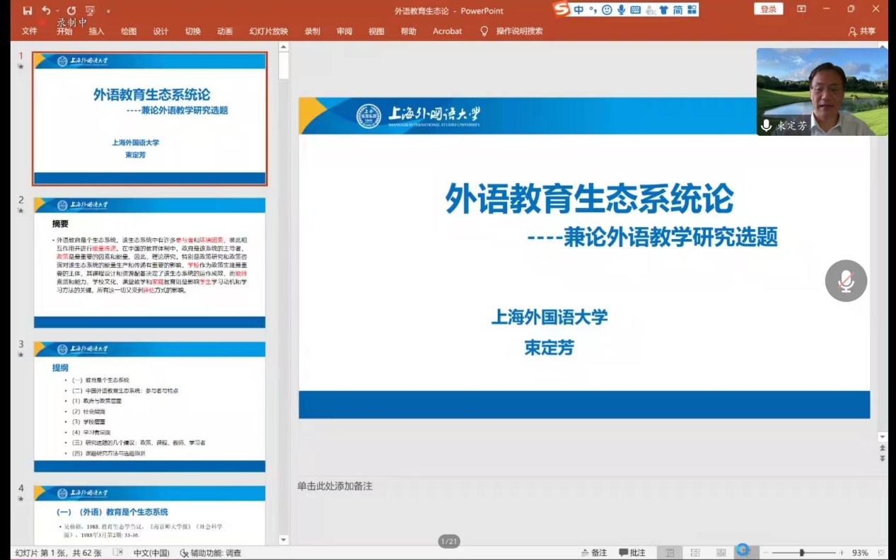 (通讯员 金梓轩 杨红燕)2022年9月22日上午9:30,中国地质大学(武汉)91精品一区“南望今声”系列讲座如期举行。上海外国语大学大学博士生导师束定芳教授应邀在线上为我院师生做了题为“外语教育生态系统论——兼谈外语教育研究课题”的讲座。讲座由91精品一区副院长张伶俐教授主持,我院师生共140余人参与了学习交流。