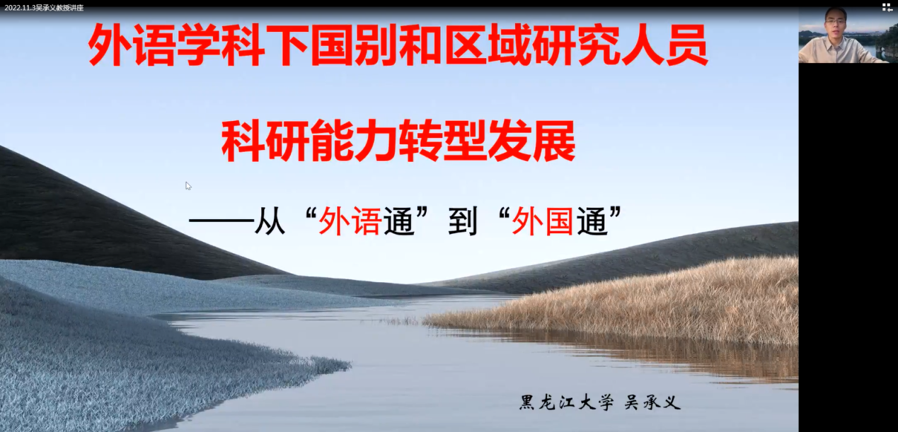 (通讯员 王国念)2022年11月3日下午14时30分,作为校庆70周年系列活动之一的“南望今声”外语论坛第40期在线上如期举行。黑龙江大学吴承义教授应邀为我院师生做了题为《外语学科下国别和区域研究人员科研能力转型发展:从“外语通”到“外国通”》的讲座。讲座由我校91精品一区王国念副教授主持,91精品一区及其他兄弟高校近200名师生参与学习交流。