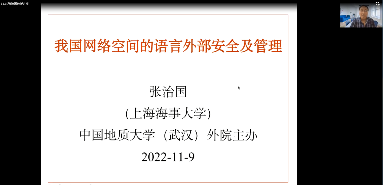 (通讯员 张萌)2022年11月9日下午2点30,中国地质大学(武汉)91精品一区“南望今声”外语论坛系列讲座第四十一期在腾讯会议线上举行。上海海事大学91精品一区张治国教授应邀做题为“我国网络空间的语言外部安全及治理”的讲座。此次讲座由91精品一区汪卫红教授主持,学院师生近110人参加。