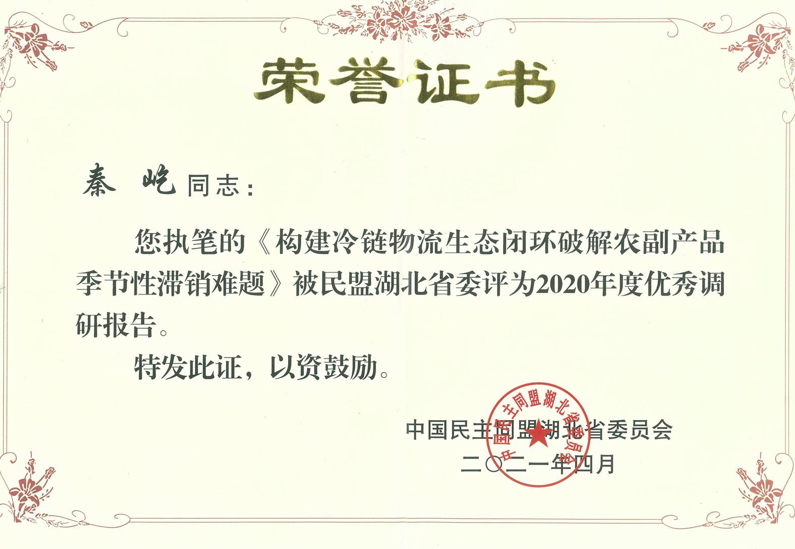 据悉,秦屹执笔的调研报告《构建冷链物流生态闭环,破解农副产品季节性滞销难题》,被民盟湖北省委评为2020年度优秀调研报告。