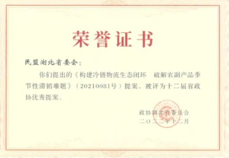 18日,省政协第十二届常委会第二十次会议上,对省政协十二届一次会议以来的100件优秀提案进行了表彰,其中民盟省委提交的集体提案中有4件被评为“优秀提案”。由民盟地大副主委、我院秦屹副教授执笔撰写的“构建冷链物流生态闭环,破解农副产品季节性滞销难题”提案被评为十二届省政协优秀提案。该提案源于国药控股湖北有限公司副董事长马占军负责的课题、秦屹执笔撰写的调研报告,后作为集体提案在2021年省政协十二届四次会议上由民盟湖北省委提交。