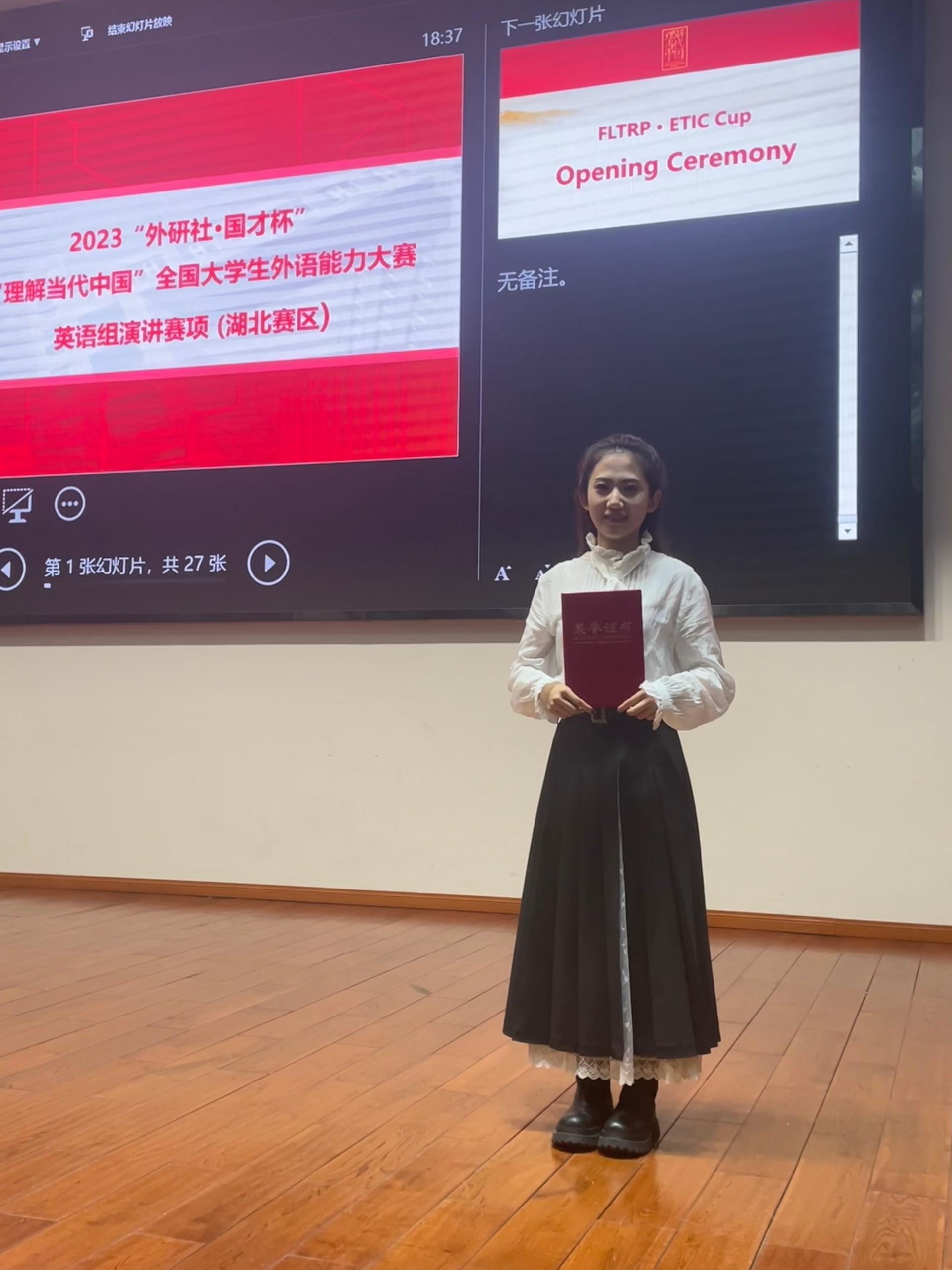 (通讯员:杨红燕)2023年10月29日,由湖北省教育厅主办,湖北省高等教育学会大学外语教学专业委员会、外语教学与研究出版社协办的2023“外研社·国才杯”“理解当代中国”全国大学生外语能力大赛演讲赛湖北赛区决赛在湖北大学举行,来自省内各高校的50名选手参加角逐。我校91精品一区2020级赵彬琪同学凭借扎实的语言功底和稳重的舞台风格在此次比赛中荣获银奖并晋级国赛。