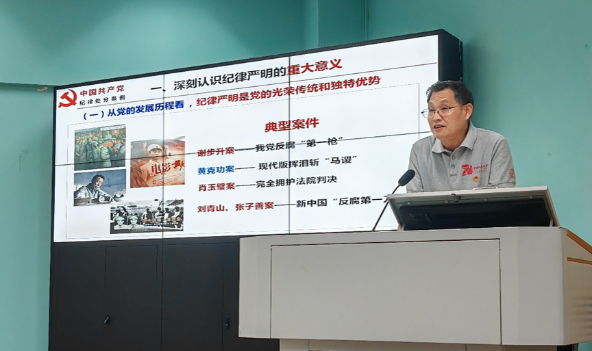 刘世勇从深刻认识纪律严明的重大意义、准确把握《中国共产党纪律处分条例》修订的主要内容和切实抓好《中国共产党纪律处分条例》的学习贯彻三个方面进行了宣讲。从党的发展历程、党面临的问题和党今后要实现的中心任务阐述了纪律严明的重大意义;结合《条例》内容,指出这次修订突出了政治性,体现了时代性,提高了针对性,增强了衔接性;他要求大家增强纪律观念,提高学习的自觉性和主动性,增强监督意识,提高贯彻执行力,落实到日常学习工作生活中。他还对学生党员在网络和社交媒体上的言行操守做出了重点提醒。最后,他希望大家心有所畏,言有所戒,行有所止。